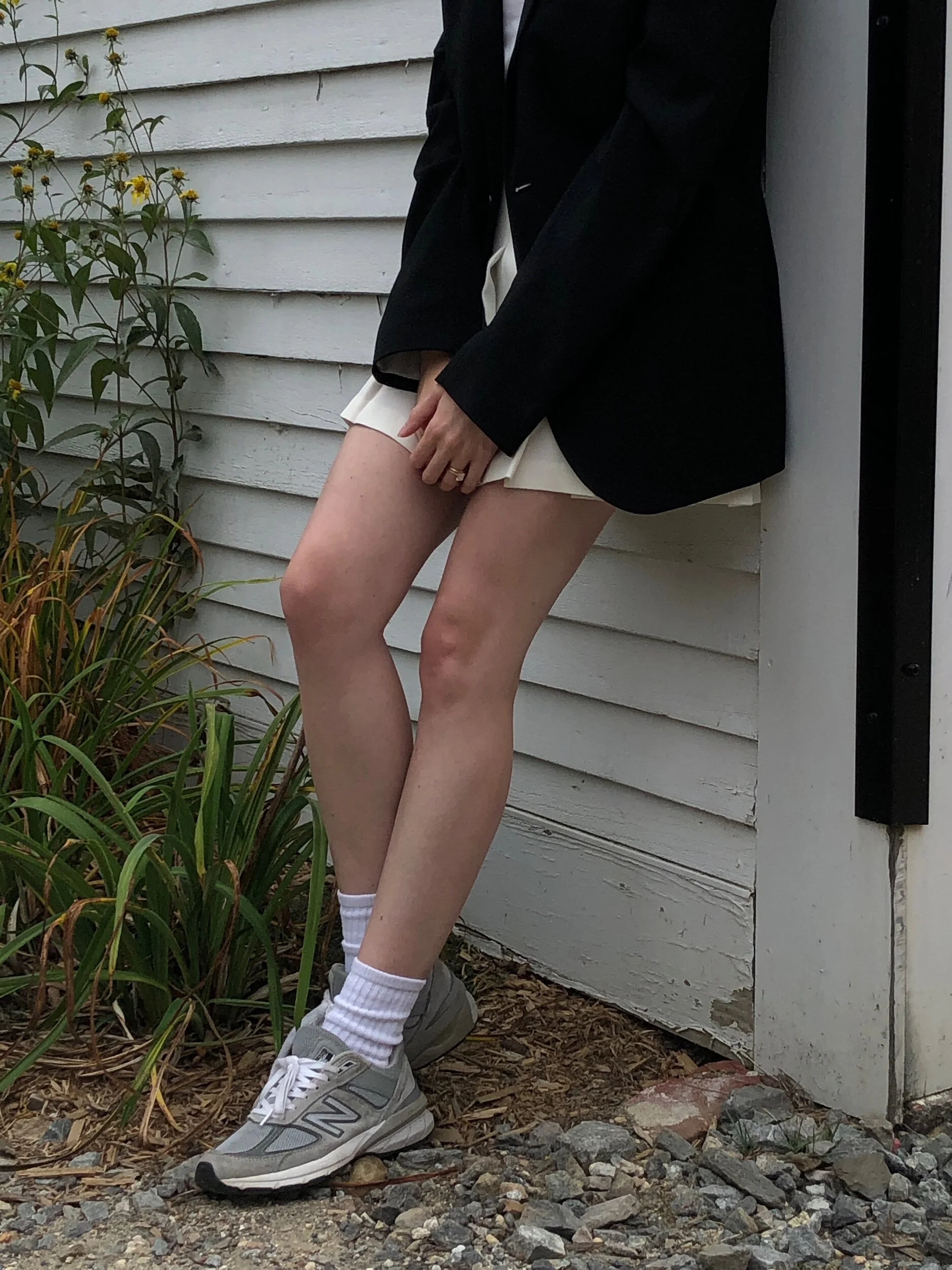 Since I’m not ready to retire this piece until the warm days return next year, I decided to style my tennis skirt for fall. It’s always fun to take staple pieces from one season and try to transition them into the next. I paired mine with a white tee, layered an oversized blazer on top and finished the look off with tube socks and my trusty New Balance 990s. The result was a look that aesthetically fell somewhere between Clueless and Rory Gilmore—and I’m not mad about it!